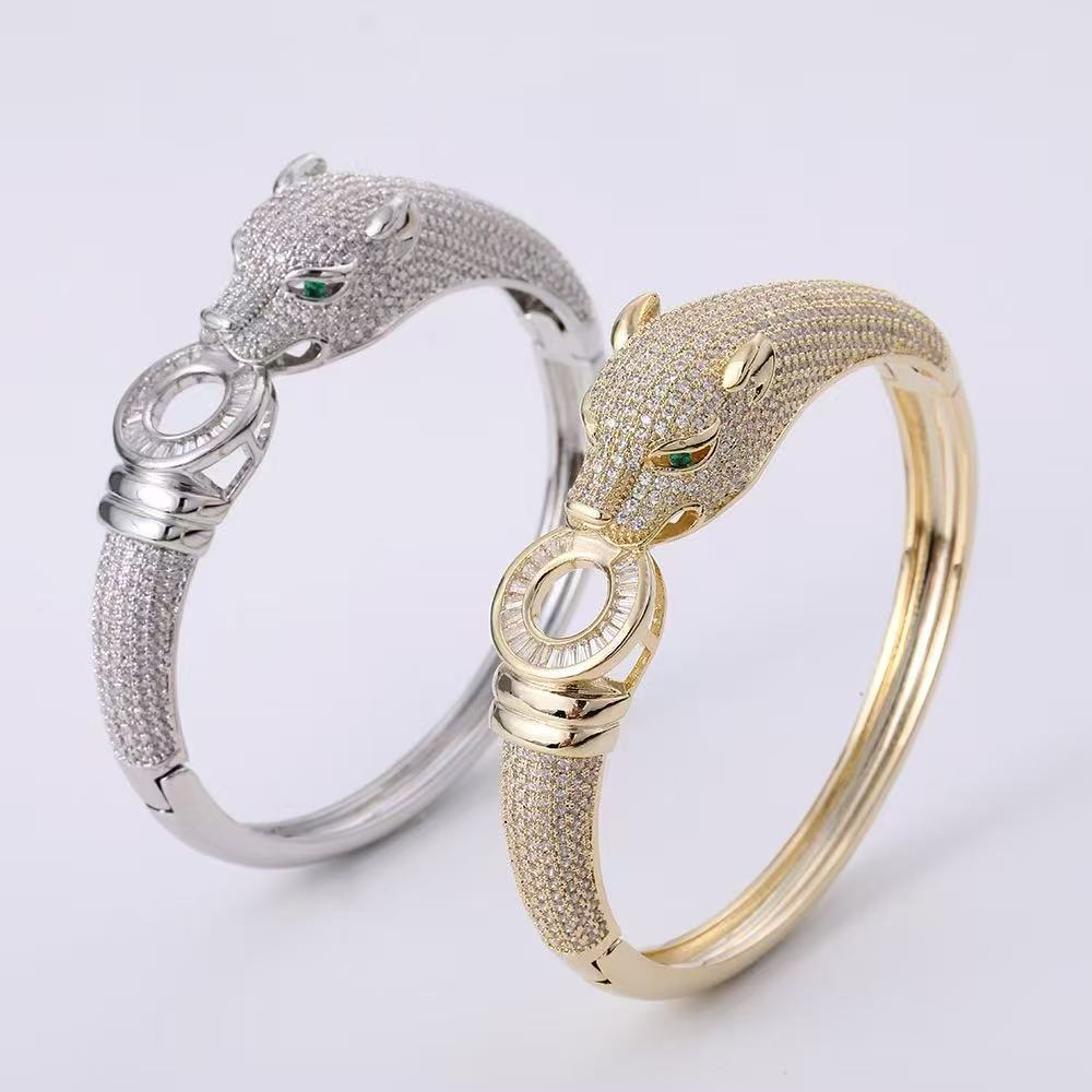 18K Triple yellow, white and rose gold plated panther heard bangle sutdded with stones.